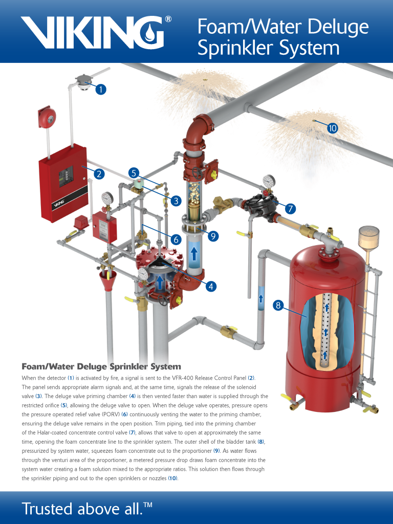 When the detector (1) is activated by fire, a signal is sent to the VFR-400 Release Control Panel (2). The panel sends appropriate alarm signals and, at the same time, signals the release of the solenoid valve (3). The deluge valve priming chamber (4) is then vented faster than water is supplied through the restricted orifice (5), allowing the deluge valve to open. When the deluge valve operates, pressure opens the pressure operated relief valve (PORV) (6) continuously venting the water in the priming chamber, ensuring the deluge valve remains in the open position. Trim piping, tied into the priming chamber of the Halar-coated concentrate control valve (7), allows that valve to open at approximately the same time, opening the foam concentrate line to the sprinkler system. The outer shell of the bladder tank (8), pressurized by system water, squeezes foam concentrate out to the proportioner (9). As water flows through the venturi area of the proportioner, a metered pressure drop draws foam concentrate into the system water, creating a foam solution mixed to the appropriate ratios. This solution then flows through the sprinkler piping and out to the open sprinklers or nozzles (10).