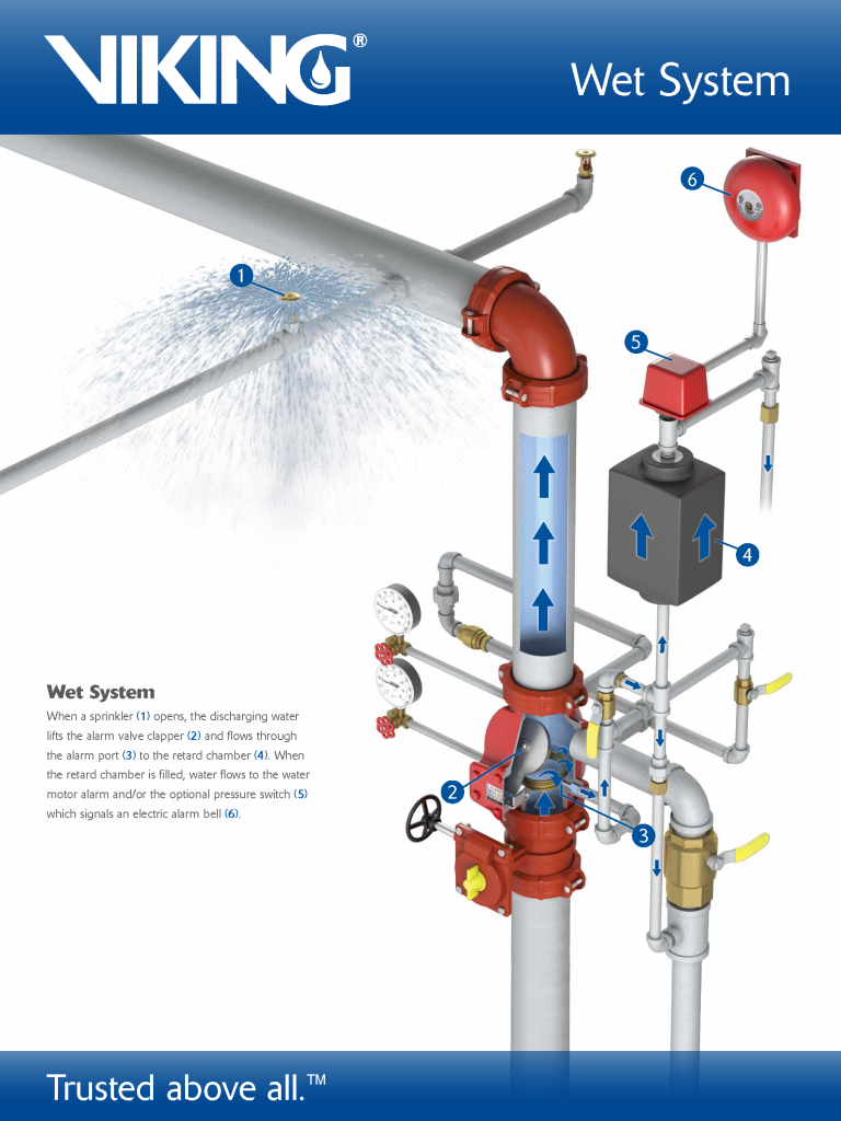 When a sprinkler (1) opens, the discharging water lifts the alarm valve clapper (2) and flows through the alarm port (3) to the retard chamber (4). When the retard chamber is filled, water flows to the water motor alarm and/or the optional pressure switch (5), which signals an electric alarm bell (6).