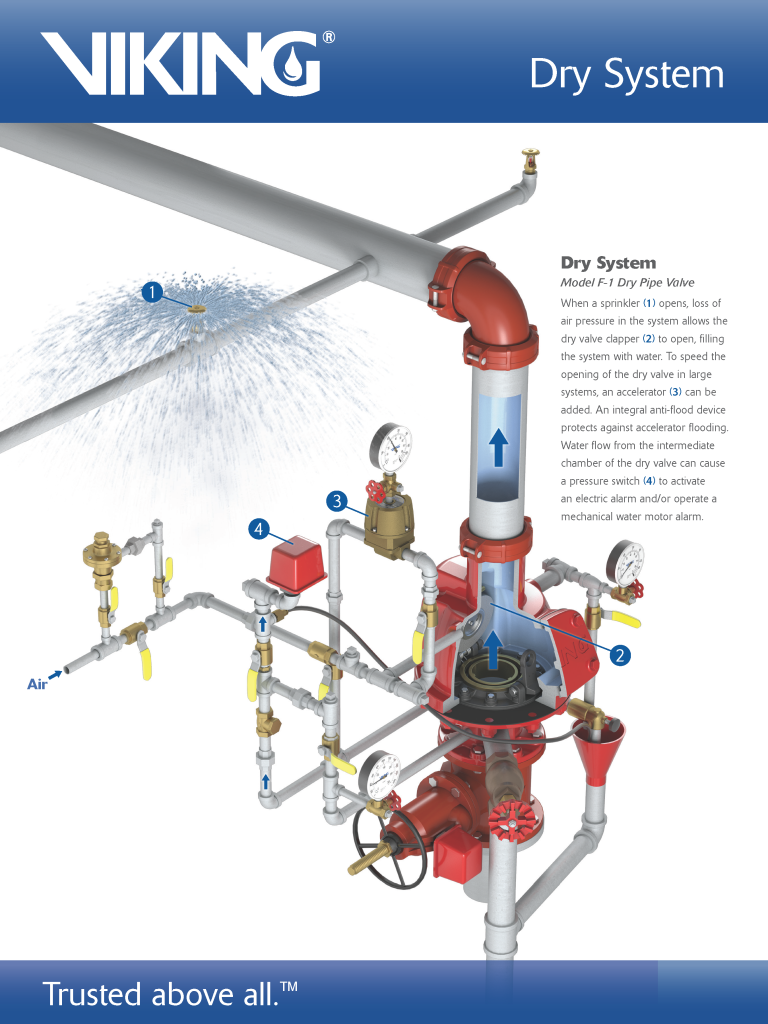 When a sprinkler (1) opens, loss of air pressure in the system allows the dry valve clapper (2) to open, filling the system with water. To speed the opening of the dry valve in large systems, an accelerator (2) can be added. An integral anti-flood device protects against accelerator flooding. Water flow from the intermediate chamber of the dry valve can cause a pressure switch (4) to activate an electric alarm and/or operate a mechanical water motor alarm.